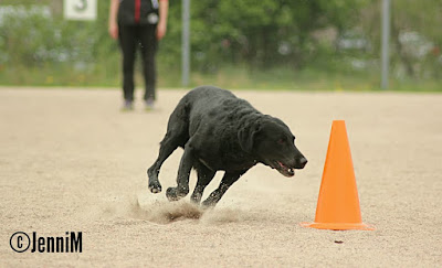 Hässäkkä: 0 - Aivan super mahtava kierto!!! Törppö oli kohti yleisöä ja treeneissä Ruu ei uskaltanut kiertää, vaikka oli tuttuja taustalla. Nyt meni lujaa ja niin suoraan. Upea! Stoppina maahan ja sekin sujui hyvin. Sitten tapahtui se perinteinen. Lähti tosi lujaa kapulalle, ei saanut sitä kyytiin ja kompuroi ja ajautui ohi esteen.